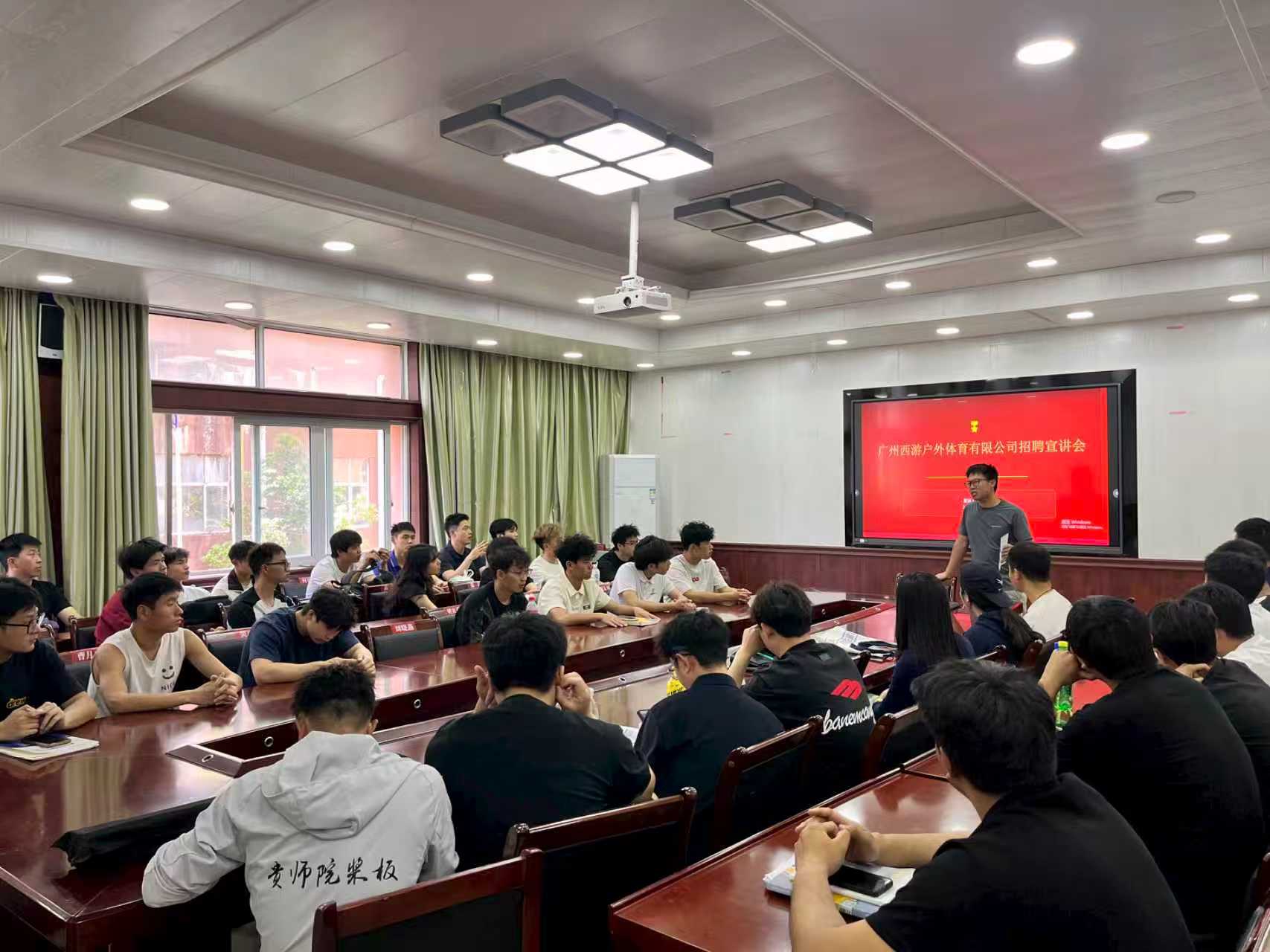 4月9日,广州西游户外体育有限公司负责人徐贵珍率招聘团队走进我院,举办专场招聘会,为休闲体育专业学子搭建优质就业桥梁。本次招聘会精准释放5个全职岗位与10个实习岗位,涵盖户外领队、赛事策划、营地运营等核心领域,吸引20余名应届毕业生及20余名在读同学踊跃参与。
