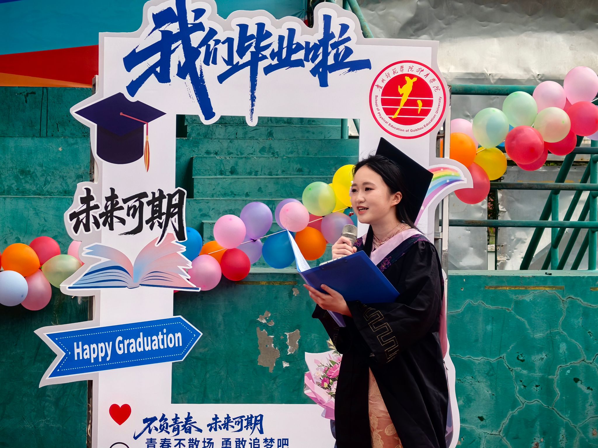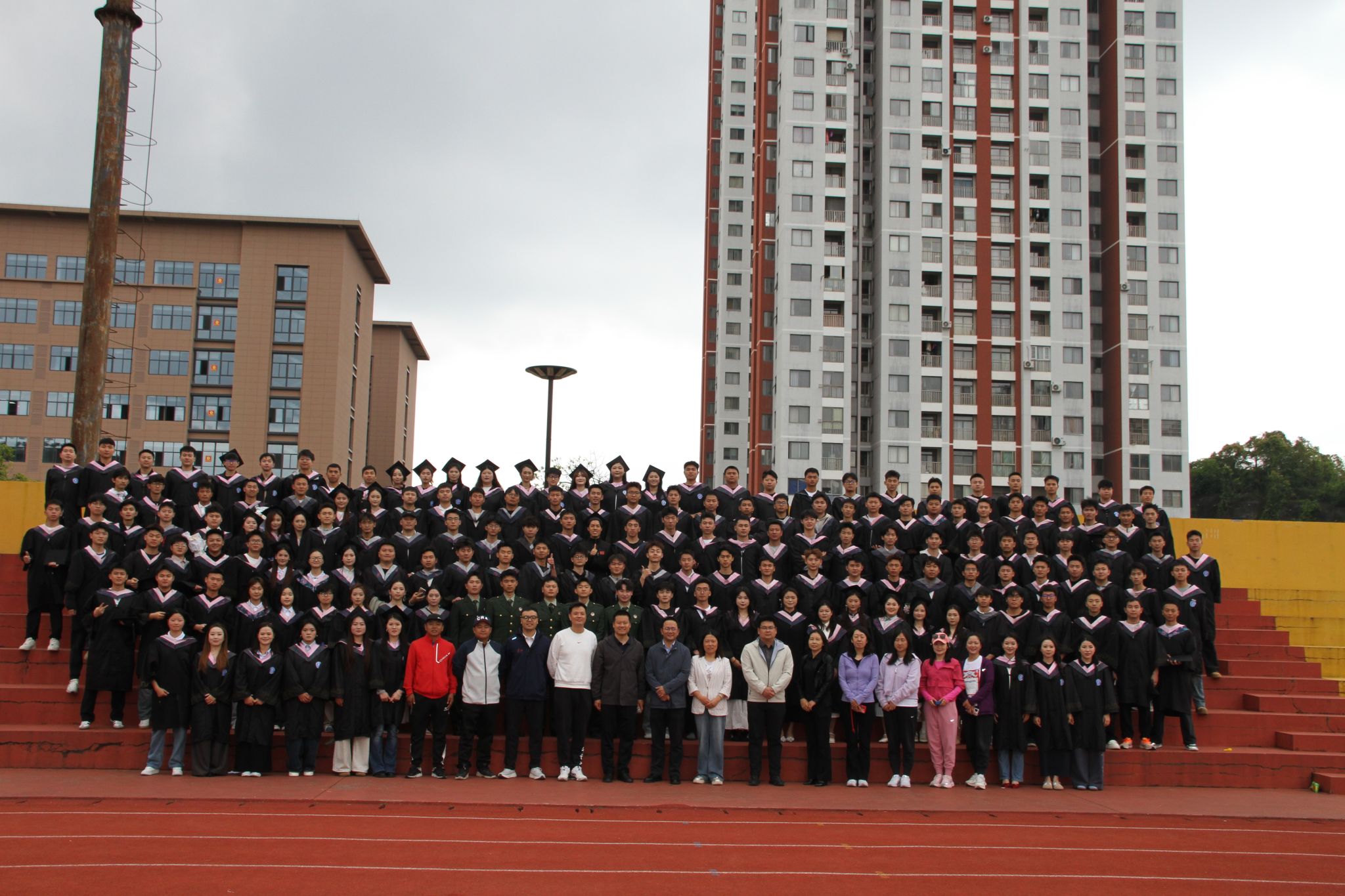 最后,全体师生共同移步运动场看台,拍摄毕业大合影。整齐排列的学士服、朝气蓬勃的青春面孔、和蔼亲切的恩师身影,一同被永久定格。四年朝夕相伴的同窗情谊、谆谆教诲的师恩难忘、校园里挥洒过的汗水与热血,都在此刻凝结成最珍贵的青春印记